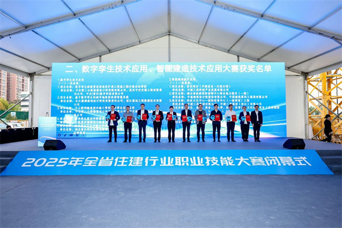 11月12日,由省住建厅、省人社厅、省科技厅、省总工会联合主办的2025年全省住建行业职业技能大赛在武汉中建三局汉韵公馆项目现场圆满闭幕。省住建厅党组成员、副厅长谈华初,省总工会党组成员、副主席冯家欣,省人社厅二级巡视员黄励,省科技厅二级巡视员吴勇杰出席闭幕式。