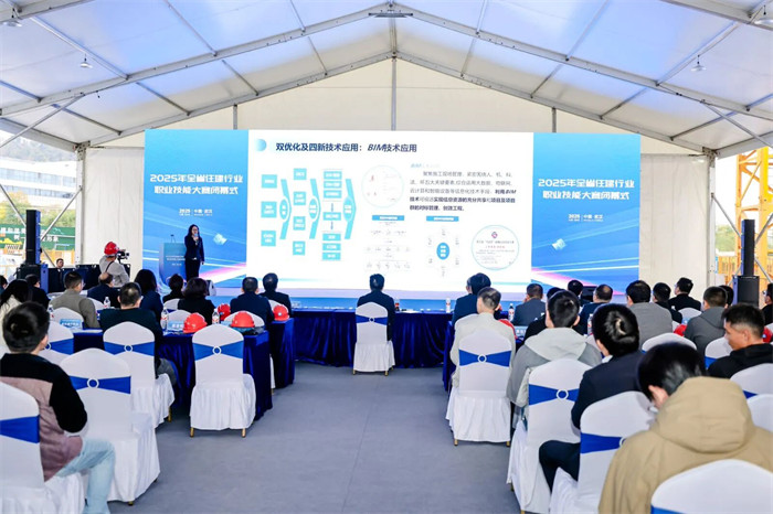科技创新成果演示环节,各大企业纷纷亮出“黑科技”。中建三局汉韵公馆项目呈现的“数字建造”实景令人瞩目:实时跳动的数据、智能安全帽“小黄人”、自主物料机器人、“造楼机双雄”与无人机编队,让“数字孪生”智慧工地从蓝图走进现实。中国一冶、中交二公院等单位分别展示了BIM技术、数字孪生隧道管控等前沿应用,获全国勘察设计大师陈楚江高度肯定。